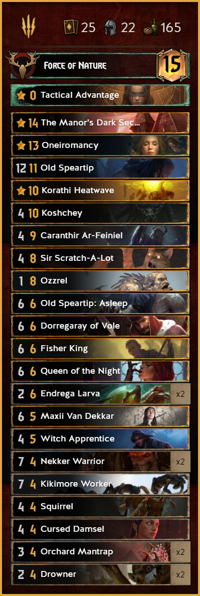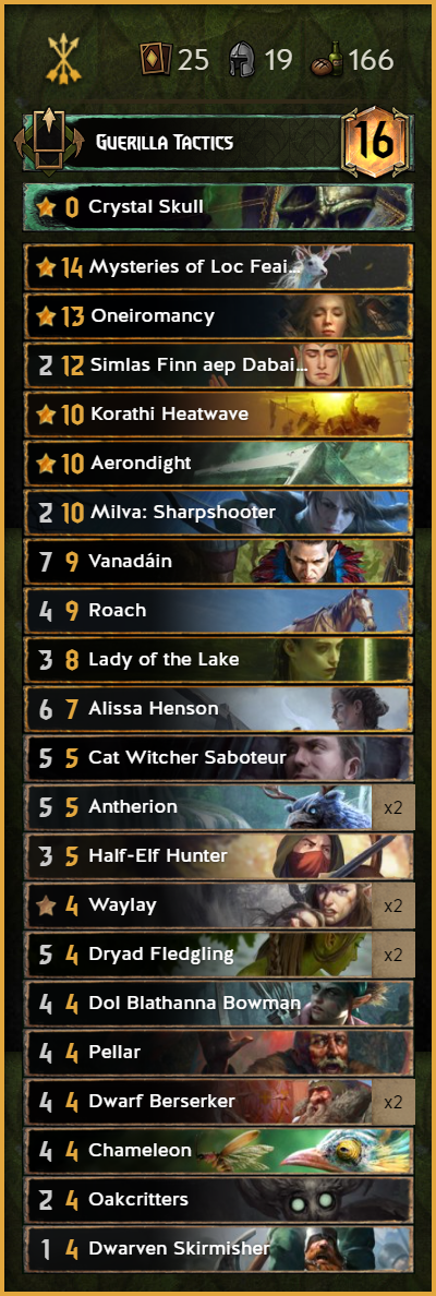 In Scoia’tael, after removing charges from Munro and stripping the armor off from Zoltan: Warrior, two cards which were a core of every Scoia’tael deck in the past season, are now not so essential and with nerfs to Renfri and Knickers, handbuff archetype is no longer viable. So it is the best time for Scoia’tael cards to sing in harmony a song about Mysteries of Loc Feainn. Harmony decks allow to control of opponent’s board state with movement package as well as Hen Gaidth Sword, while building points of our own with the harmony engines. The addition of new tags for a big number of Scoia’tael units makes the first chapter in Mysteries of Loc Feainn a nightmare for our opponent.