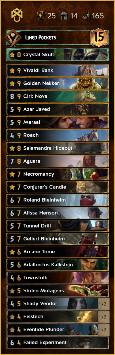 For the last, let’s walk down the mean street of Novigrad. Syndicate is the only faction to still use Golden Nekker to its full potential. While there are decks all around that focus on boosting themselves to huge numbers, there is also a way to answer them, and no, it’s not Geralt: Yrden. The way is a collection of poisons brewed by the Bleinheim brothers. Denying ourselves cards with 10 or more provisions may be an inconvenience, but the potential of Golden Nekker in a short round is turning that inconvenience barely noticeable. And although several cards received some nerfs in the recent patch, the archetype still remains one of the strongest in the current meta.