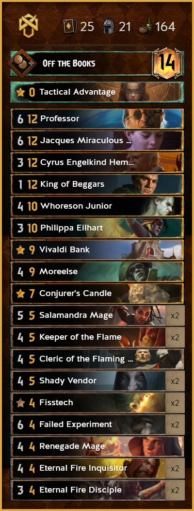If suspicious potions are not your thing and instead you prefer a more “classic” style, pay a visit to Putrid Grove, where King of Beggars gathered together some of the most nefarious individuals from the Free City of Novigrad. Devo SY always was an example of a proper midrange deck. Remaining strong regardless of later rounds’ lengths, allows us to commit less in the first round. Jacques will reward you for playing Firesworns, like Cyrus or bronze Eternal Fire cards, Conjurer’s Candle will protect you from overprofiting and Salamandra Mages are still one of the best 5-provision units in the game. At the same time, poison package will deal with the opponent’s tall units, while Professor and Whoreson Junior clean the opponent’s board from those pesky engines.