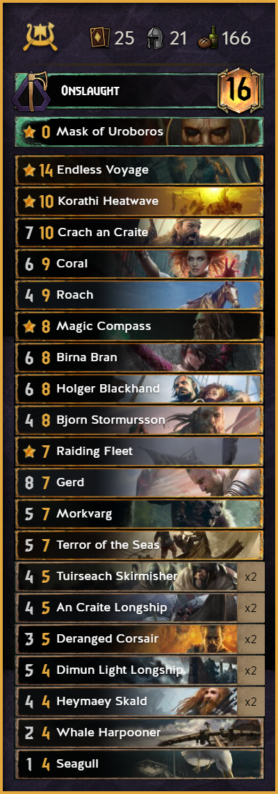 The pirates of Skellige embark on an Endless Voyage right after throwing Renfri overboard. After all, an old sailor’s superstition says that a woman on board brings misfortune. Nevertheless, they took Coral and Birna instead with them, probably because they are in possession of a magic compass. Now without Renfri, they can use their Raiding Fleet to bleed enemy units, burn artifacts with Korathi Heatwave and pillage MMR from their vaults.