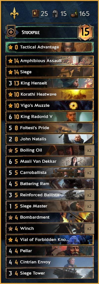 Because of decks like elf spam and cultists spam, siege becomes once again a great deck to play. You can easily 2:0 opponents, thanks to a wide range of damage dealing engines and Henselt in a combination with Foltest’s Pride, and your leader can do more than 30 points in one move. Whatever appears on the board will be swept away before it can do anything, I assure you.