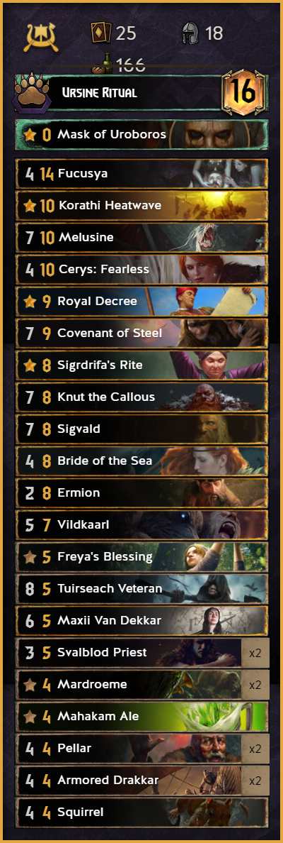 It’s also okay, if you don’t want to spend your time with the sea wolves, there’s still an alternative for you in the form of a pretty familiar archetype – self-wound. Melusine is eager to rule the ladder once again, meaning it’s time for a return of this pointslam deck with a pinch of control. We have this worshiped giant ekhidna, growing by dozens of points for later rounds and a duo of Sigvald and Knut, ensuring that no opponent unit stays on the board longer than Melusine allows it.