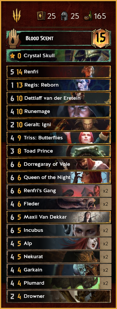 Against MO just lock their Fleders, also keep in mind that you can mulligan away your Renfris Gang because they have their own, which you can copy with Braathens or Informant. Round one in this matchup is crucial, you are favored in long round 3, he knows that he will commit round one to bleed you out and try to win a short round 3 with Regis.