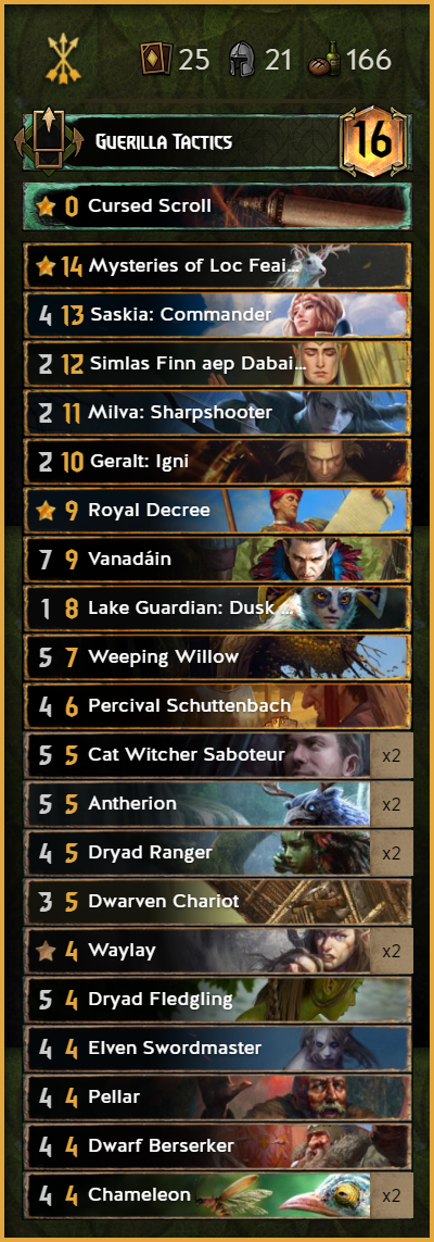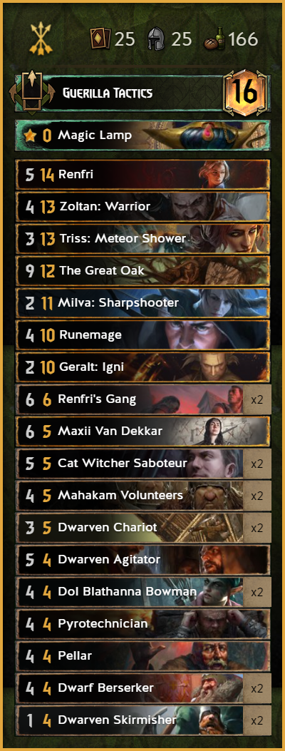 This midrange list bows down to the old Munro and Zoltan combo, which was in every Scoia’tael deck, but after nerfs, it has only Zoltan to give us wide reach with leader and body for Oak and Triss. The deck like other midrange decks has very few engines – only Chariots and Agitator, which mostly rely on killing your opponent’s units.