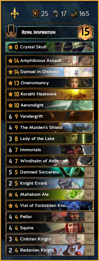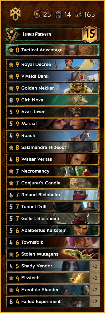 Look for golds, having access to both Saskia and Vanadain or at least one of them can be crucial for winning round one. If you have access to Vanadain you should consider keeping Waylays in hand because he can put them on the bottom of the deck, just like your stratagem.