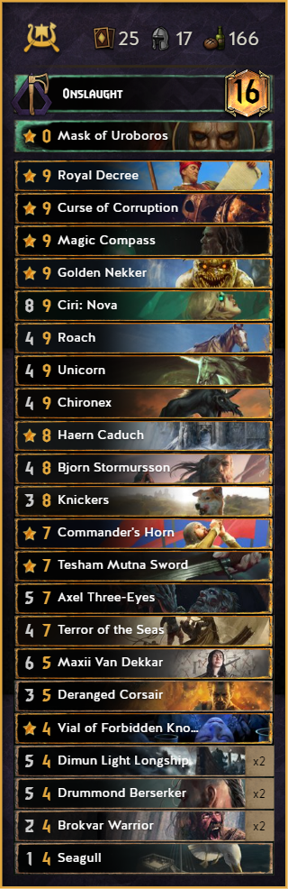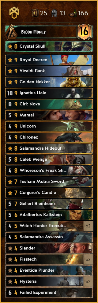 Once again bounty proves itself as one of the best decks in current meta. Nekker works really well with poison package and Golden Nekker. This golden statue often allows you to set up single turn poisoning and gives potential for another one thanks to Salamandra Hideout. It all works perfectly in both short and long round.