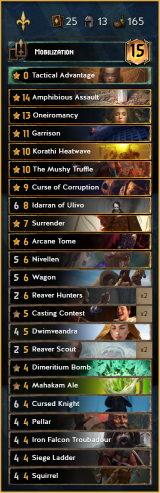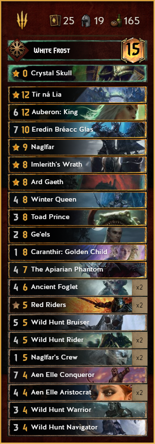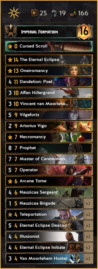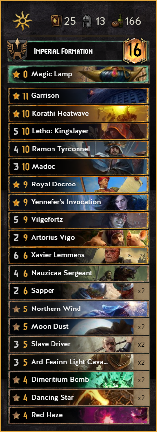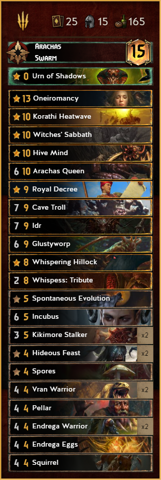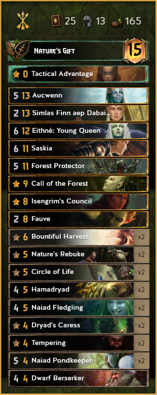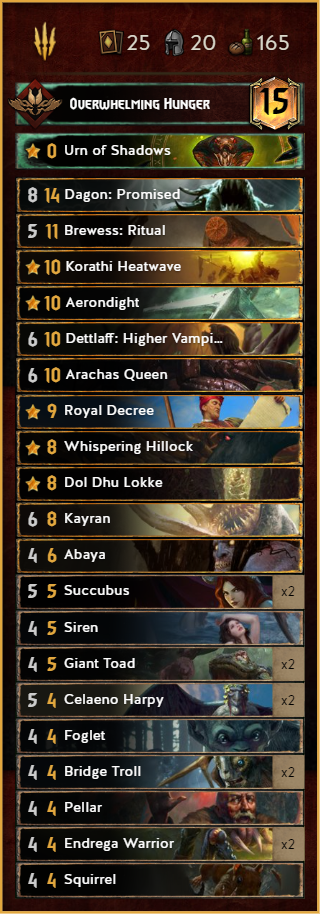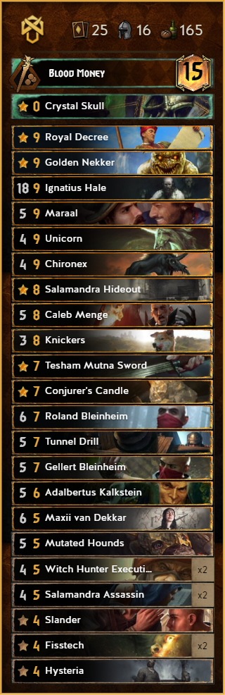 One of the new contenders in the roster. After the meta started to be greedier and greedier some people looked again on this forgotten 10p Witcher. This deck provides a lot of control, which makes matchups like SY or Harmony really easy.