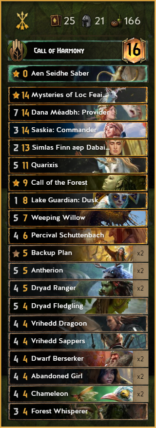 Harmony still have a punch, even after Saskias double nerf. Now we are presenting you changed leader in addition of Quaraxis. Call of Harmony might be greedier than Guerilla Tactics but it’s funnier and have bigger highroll potential.