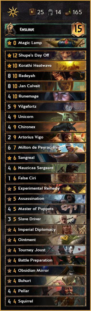 This month we present you a new list of Enslave, still control but also with some different tools. Lots of flexibility provided thanks to Shupe and Radeyah makes this deck different and more combo oriented with cards like Milton, Sangreal and False Ciri.