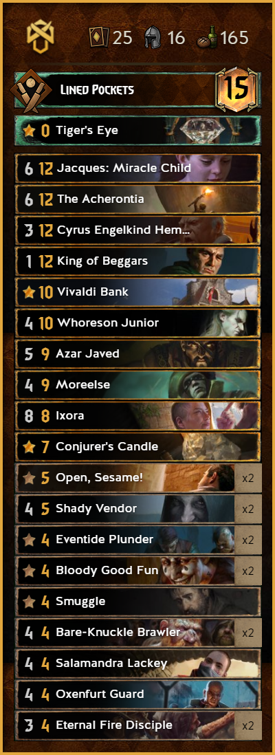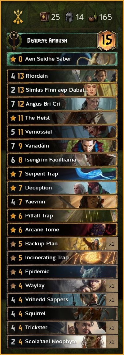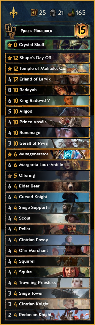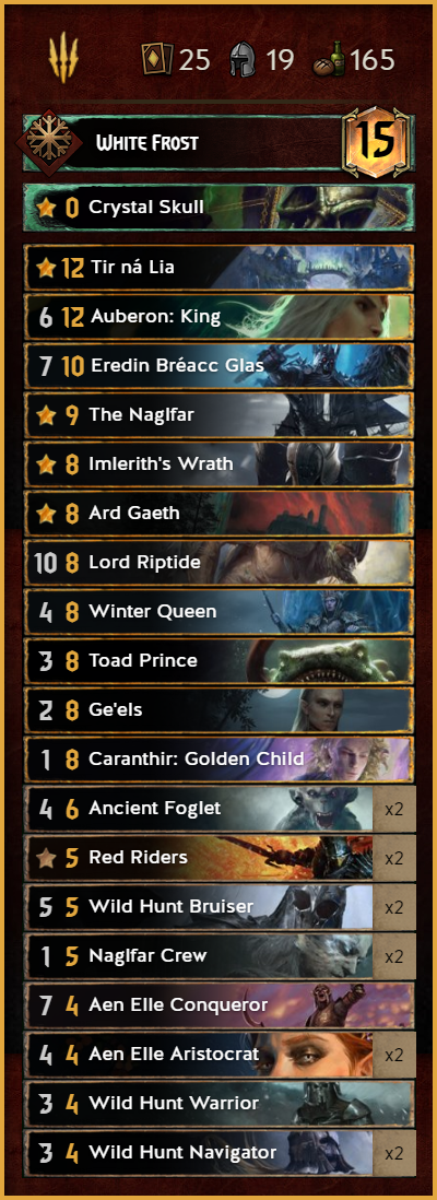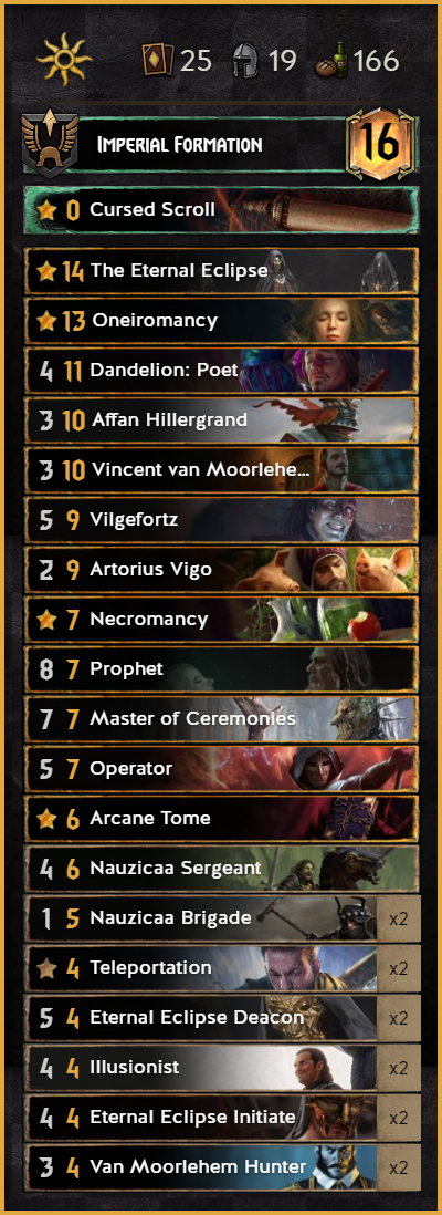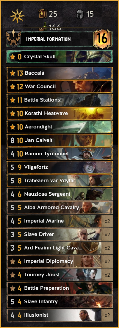 Despite the provision nerf to Imperial Marine, they are still amazing engines with Calveit setting up your topdecks and the ability to play two cards in one turn with Battle Stations. They are supported with the rest of the bronze Soldier package along with Ramon and Slave Drivers to copy whichever bronze fits your needs. High end golds like Baccalà, War Council and Battle Stations provide a lot of tempo so we pair them with Aerondight to give us a strong carryover finisher and potential control tool. Additionally the Location order abilities provide a lot of flexibility both bleeding and being bled. The deck is rounded out with Heatwave and Vilgefortz to provide tall punish and answer general threats, as well as Traheaern to force our opponents to adapt.