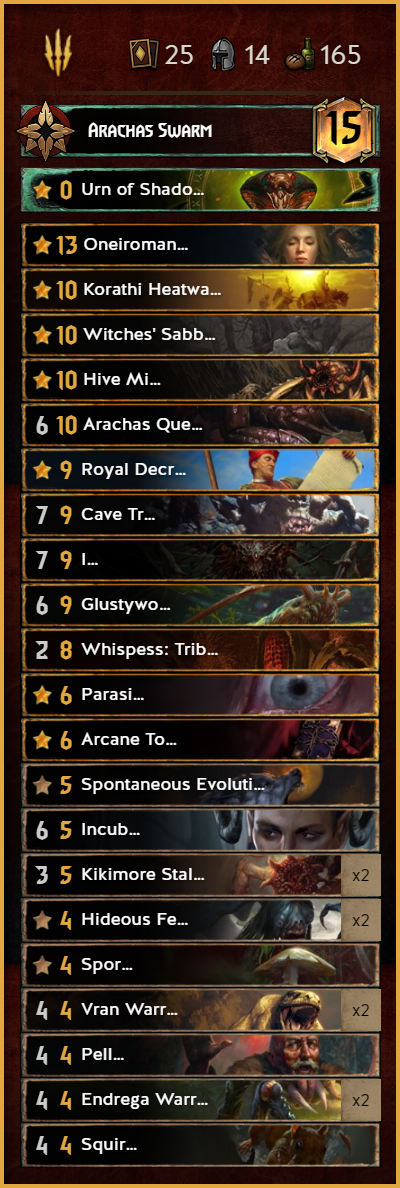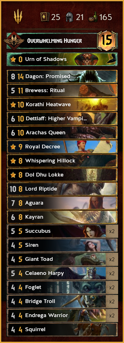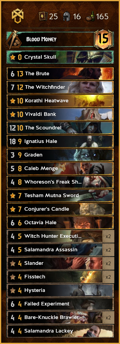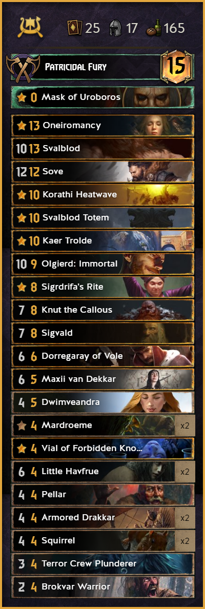 The deck may look simple and straightforward but there is some skill to maximizing the amount of points you get from Vran/Glusty and decks that take round 1 and bleed take some skill to fend off.