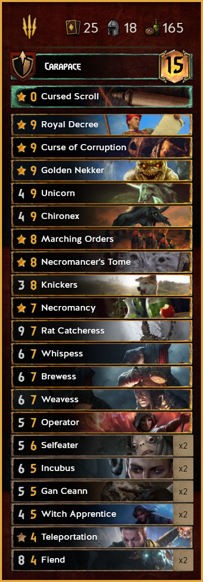 Relicts are back after becoming very skilled at reading about necromancy! The deck revolves around setting a strong round with Necromancer’s Tome and playing two bronze relicts each turn, overwhelming your opponent with numerous engines and classic relict pointslam. Additionally, with Tome being played from Nekker we can trigger it in the same turn with Necromancy or Teleportation. Ensure you play Operator into Selfeaters round 1 (Cursed Scroll is inculded to ensure we have a Selfeater in our round 1 hand) so that your Incubi gives your opponent a terrible trade where they get a useless Selfeater and you get a huge Selfeater ready to split. Use your Carapace leader to protect your key bronze engines such as Selfeaters and Witch Apprentice. Unicorn combo provides amazing tempo, especially with multiple Selfeaters on board. Make sure you use your limited control tools of Chironex, Whispess and Curse of Corruption wisely (and don’t brick your Curse).