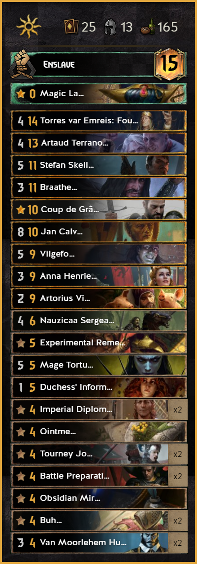 Enslave 6 Assimilate has risen a bit in popularity this season, not in small part because it counters the Imperial Formation Battle Stations decks that love to spam soldiers. This particular version utilizes Braathens and Informants to out-soldier the opponent, and the 4p locks (from hand or Vigo) fill in any control gaps that aren’t covered by Skellen or Vilgefortz.