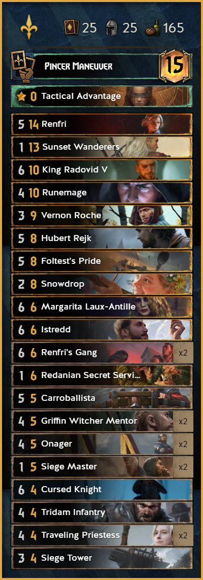 Carryover Engine Priestesses with Renfri are dangerous when they gain round control. To achieve round control feel free to use your Istredd and Snowdrop combo with other machines. Bleed your opponent, then setup Onager and play for last say Vernon pulling out Priestess with Tridam Infantry to wipe your opponent’s board.
